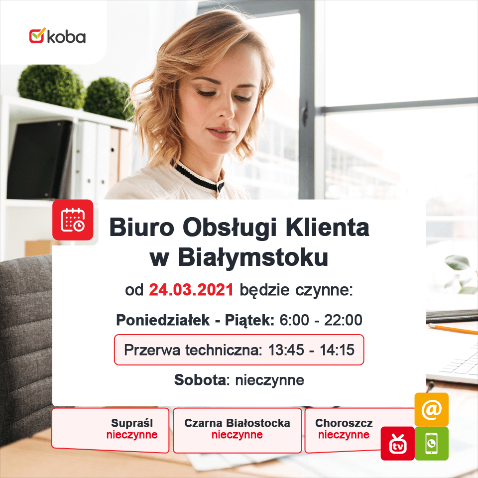 Biuro Obsługi Klienta w Białymstoku od 24.03.2021 będzie czynne: