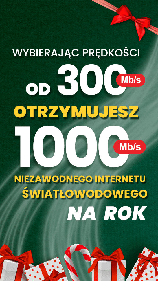 Wybierz od 300 Mb/s, a my podarujemy Ci aż 1000 Mb/s na cały rok! Idealny internet do pracy, nauki i świątecznej rozrywki – teraz szybciej niż kiedykolwiek.
