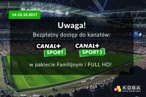 Już od 14 do 22 października wszyscy abonenci pakietów: Familijny i Full HD, którzy nie mają wykupionego pakietu CANAL+ będą mogli cieszyć się bezpłatnym dostępem do kanałów CANAL+ Sport i CANAL+ Sport 2. Programy będą dostępne na na kanale 201 i 202
