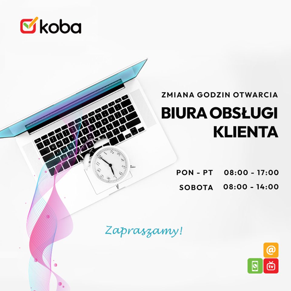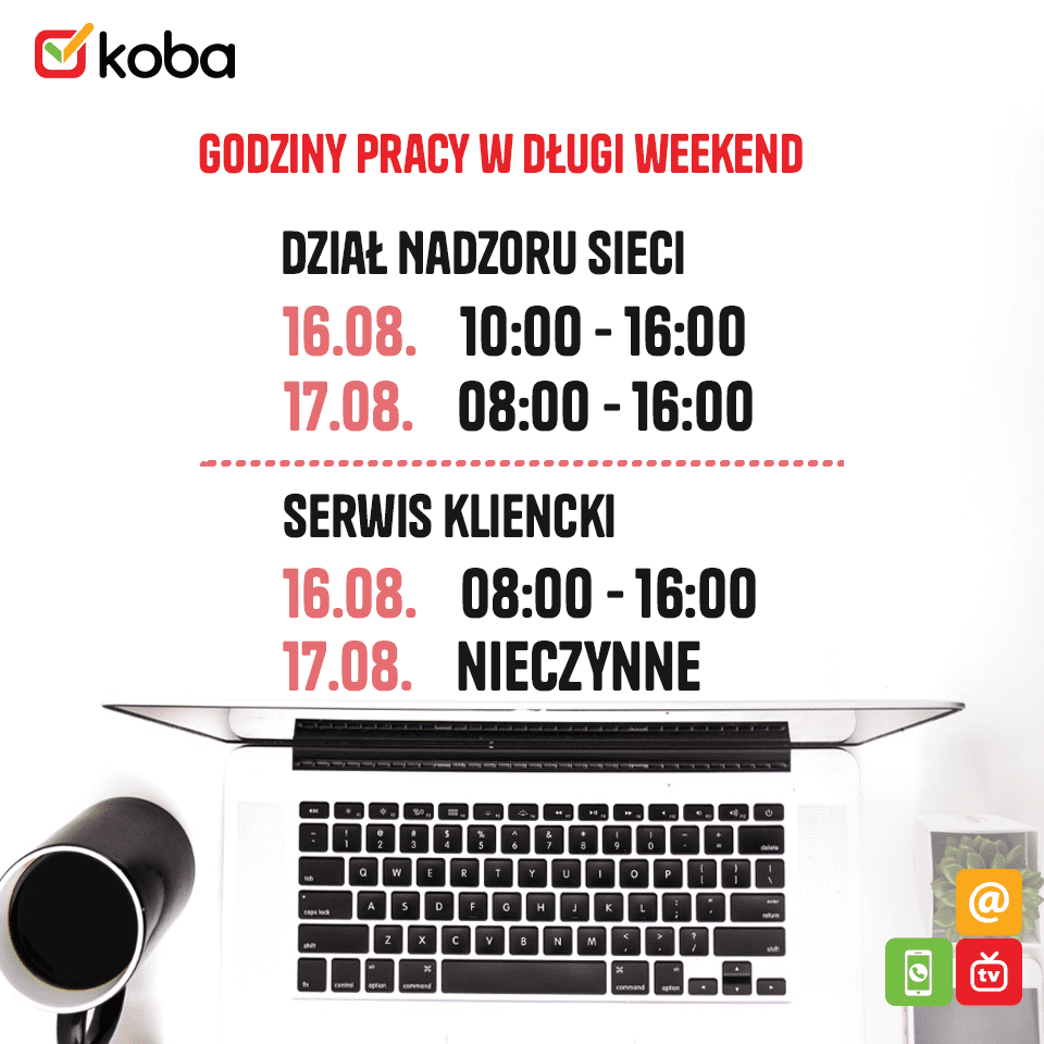 Szanowni Klienci, Uprzejmie informujemy, że: Biura Obsługi Klienta 📅 10–11 listopada — nieczynne Infolinia 📅 8 listopada (sobota) — dostępna w godzinach 8:00–14:00 📅 10–11 listopada — nieczynna Dział Nadzoru Sieci 📅 9–11 listopada — pracuje w godzinach 10:00–16:00 Serwis Komputerowy 📅 10–11 listopada — nieczynny Dziękujemy za zrozumienie.