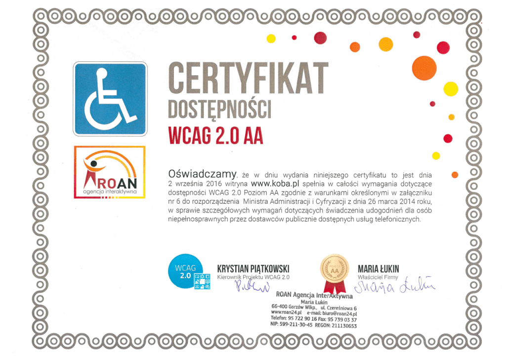 Szacuje się, że osoby z różnymi rodzajami niepełnosprawności stanowią 1/7 całej populacji światowej. Nawet przy ostrożnym założeniu, że tylko 1/10 z nich korzysta z internetu, jest to ogromna grupa, o której nie wolno zapominać! Podążając za tą myślą, miło jest nam poinformować iż nasza strona internetowa www.koba.pl jest dostosowana do potrzeb osób niepełnosprawnych:-)