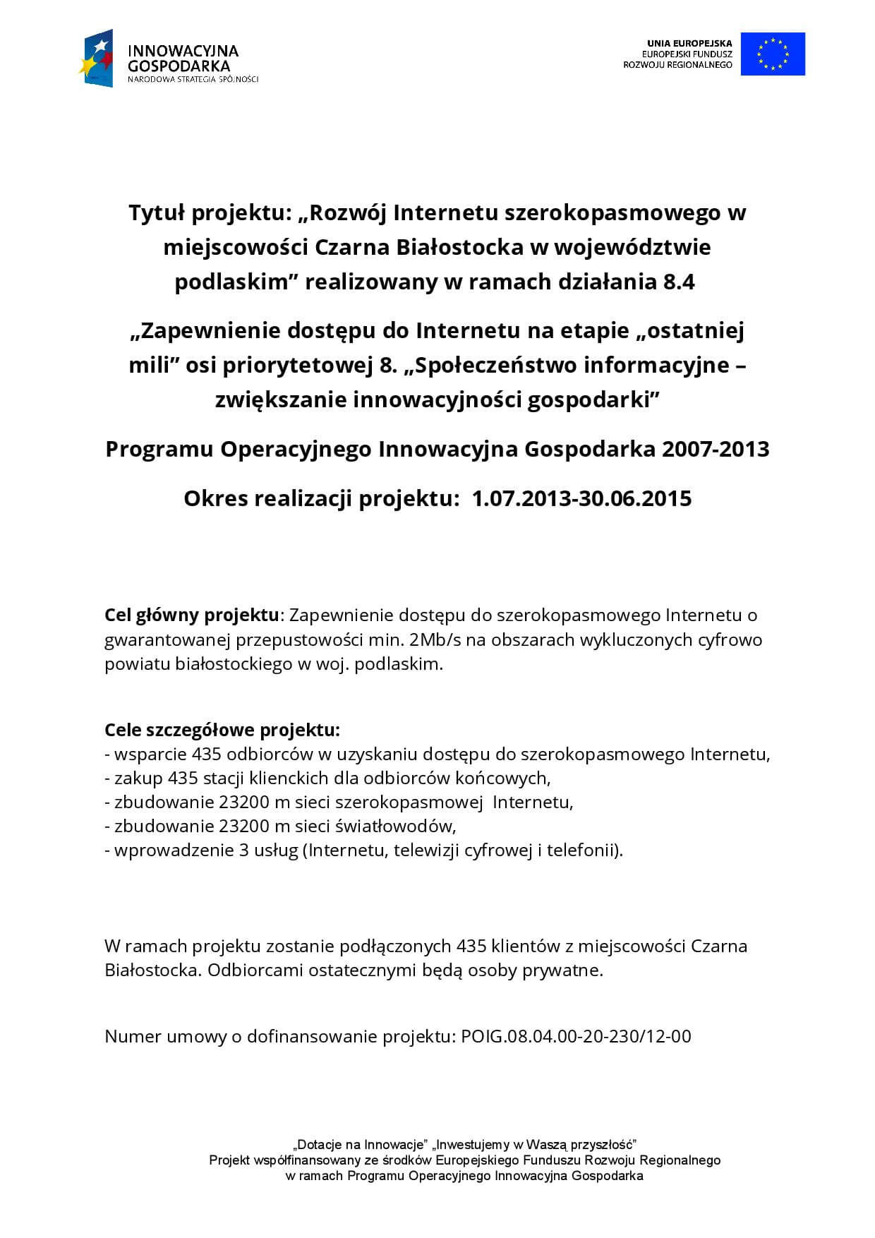 Celem projektu jest zapewnienie możliwości dostępu do szerokopasmowego Internetu o wysokich przepustowościach gospodarstwom domowym oraz placówkom oświatowym należącym do tzw. „białych plam” na obszarze białostockim poprzez budowę niezbędnej infrastruktury telekomunikacyjnej.