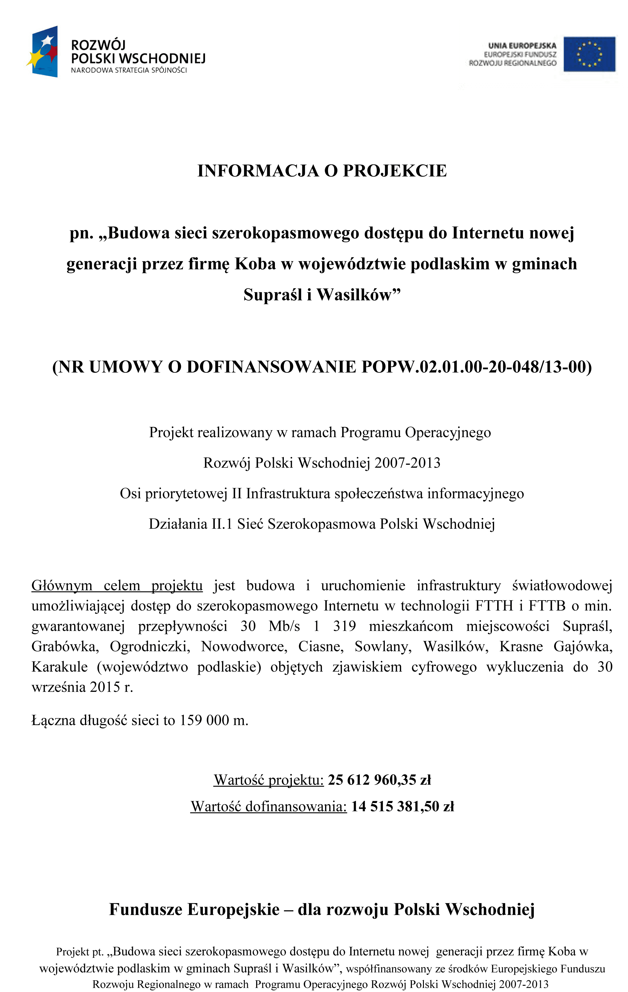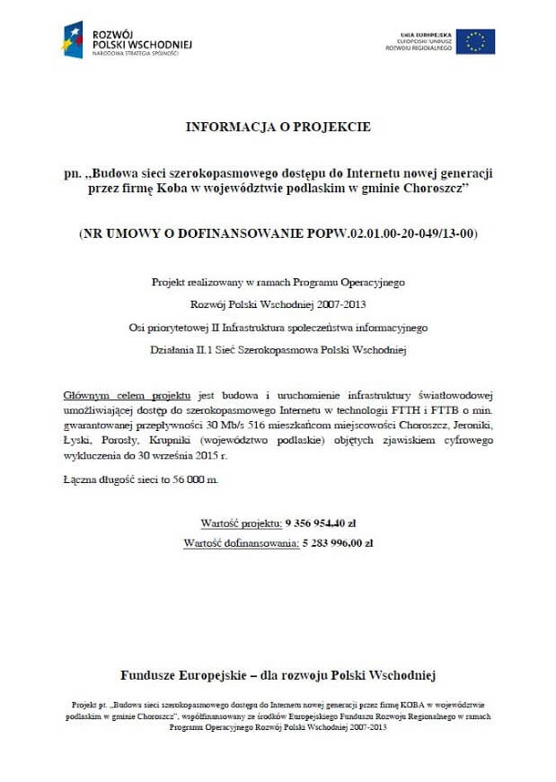 KOBA Sp. z o.o. przystępuje do realizacji projektu POPC.01.01.00–20–0079/17 pn. Budowa sieci szerokopasmowego dostępu do Internetu nowej generacji przez firmę KOBA Sp. z o.o. w wybranych miejscowościach na obszarze białostockim (ID Obszaru: 3.3.20.37) w ramach Programu Operacyjnego Polska Cyfrowa na lata 2014-2021, Działania 1.1, „ Wyeliminowanie terytorialnych różnic w możliwości dostępu do szerokopasmowego internetu o wysokich przepustowościach”