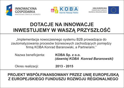 KOBA Sp. z o.o. realizuje projekt POPW.01.04.00-20-0030/16. „Wzrost konkurencyjności i innowacyjności usług firmy KOBA Sp. z o.o. poprzez wdrożenie strategii wzornictwa usług” w ramach działania 1.4 Wzór na konkurencję Programu Operacyjnego Polska Wschodnia 2014-2020 współfinansowanego ze środków Europejskiego Funduszu Rozwoju Regionalnego.