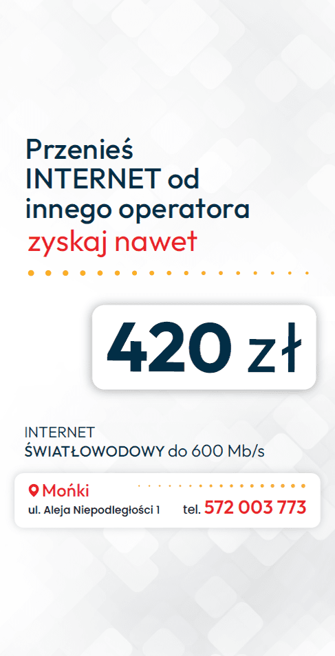 Jako lokalna firma telekomunikacyjna, jesteśmy dumni z naszej roli w rozwoju urokliwej miejscowości Mońki na Podlasiu. Nasza misja to zapewnienie mieszkańcom Moniek dostępu do szybkiego Internetu, usług telewizji cyfrowej i telefonii o najwyższej jakości. Dzięki naszym usługom nie tylko umożliwiamy sprawną komunikację, ale także przyczyniamy się do rozwoju tej malowniczej okolicy.