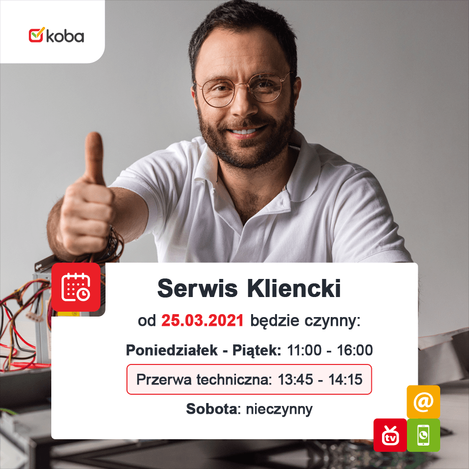 25 marca 2021 Serwis Kliencki w Białymstoku od 25.03.2021… Serwis Kliencki w Białymstoku od 25.03.2021 będzie czynny: Poniedziałek – Piątek: 11:00-16:00 Przerwa techniczna: 13:45 – 14:15 Sobota: nieczynny