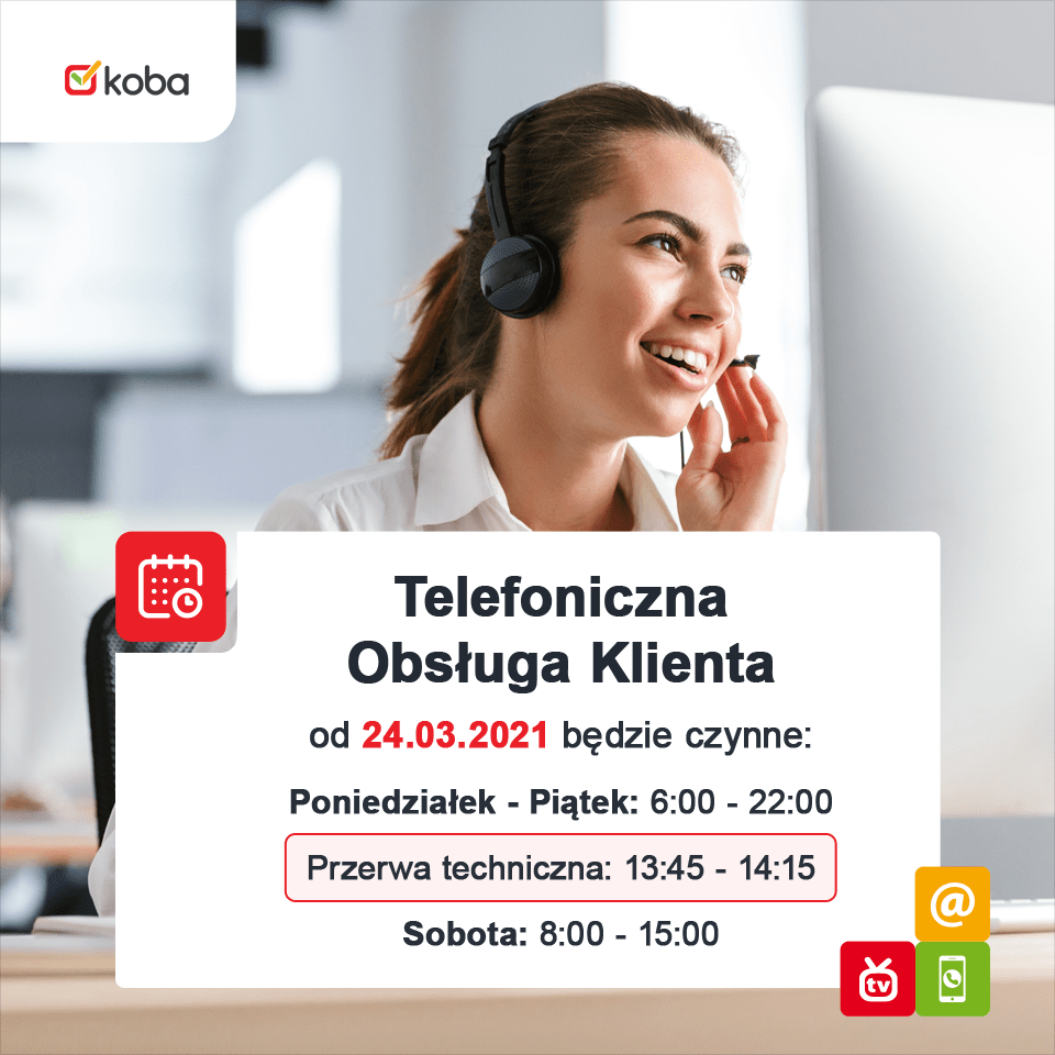 24 marca 2021 Telefoniczna Obsługa Klienta od 24.03.2021… Telefoniczna Obsługa Klienta od 24.03.2021 będzie czynna: Poniedziałek – Piątek: 6:00-22:00 Przerwa techniczna: 13:45 – 14:15 Sobota: 8:00-15:00