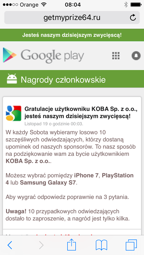 Ostrzegamy o próbach wyłudzenia danych od nieświadomych użytkowników – wiadomość o konkursie pojawia się w przeglądarce. Jest to sprytnie przygotowana pułapka.
