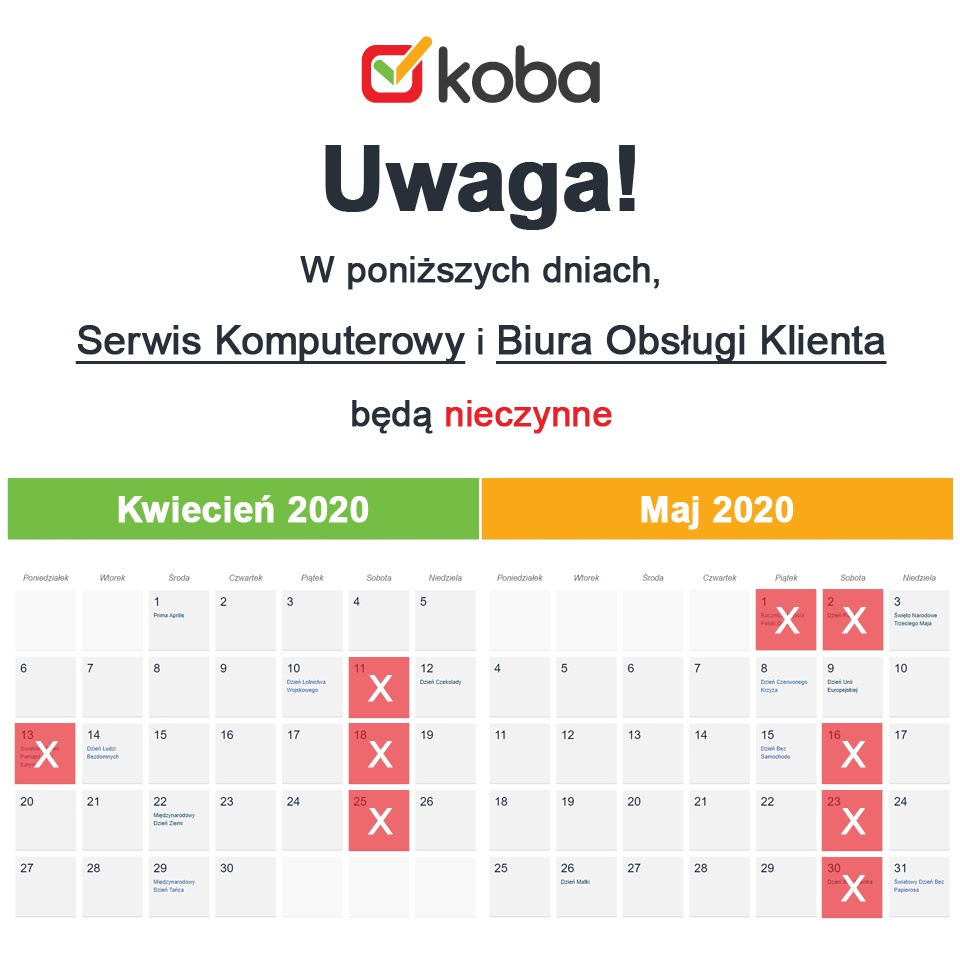 9 kwietnia 2020 Uwaga! W poniższych dniach, Serwis Komputerowy i Biura Obsługi Klienta będą nieczynne