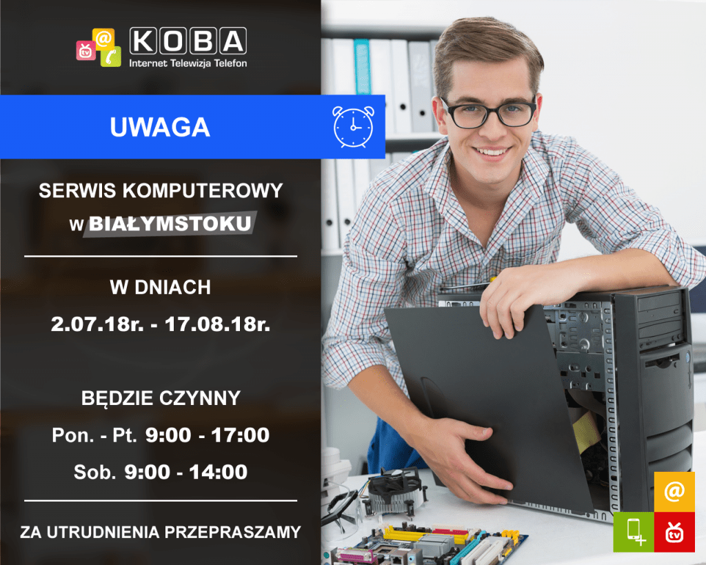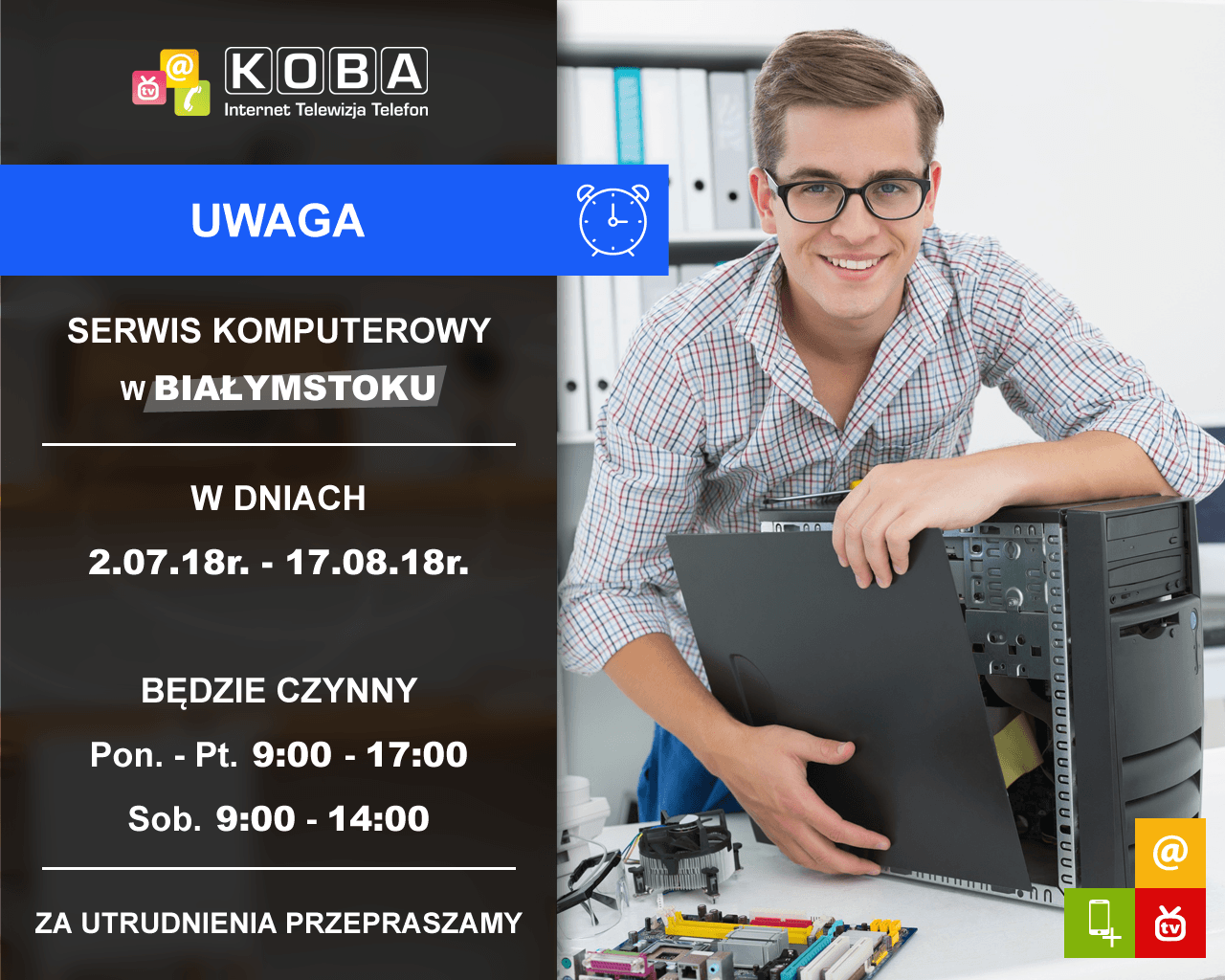 Informujemy, że w okresie wakacyjnym czyli od 2.07.2018r. do 17.08.2018r. Serwis Komputerowy w Białymstoku czynny będzie w następujących godzinach: