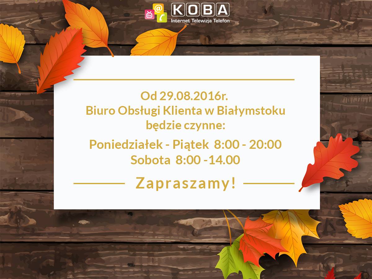 Od 29.08.2016r. Biuro Obsługi Klienta w Białymstoku będzie czynne w godzinach:
