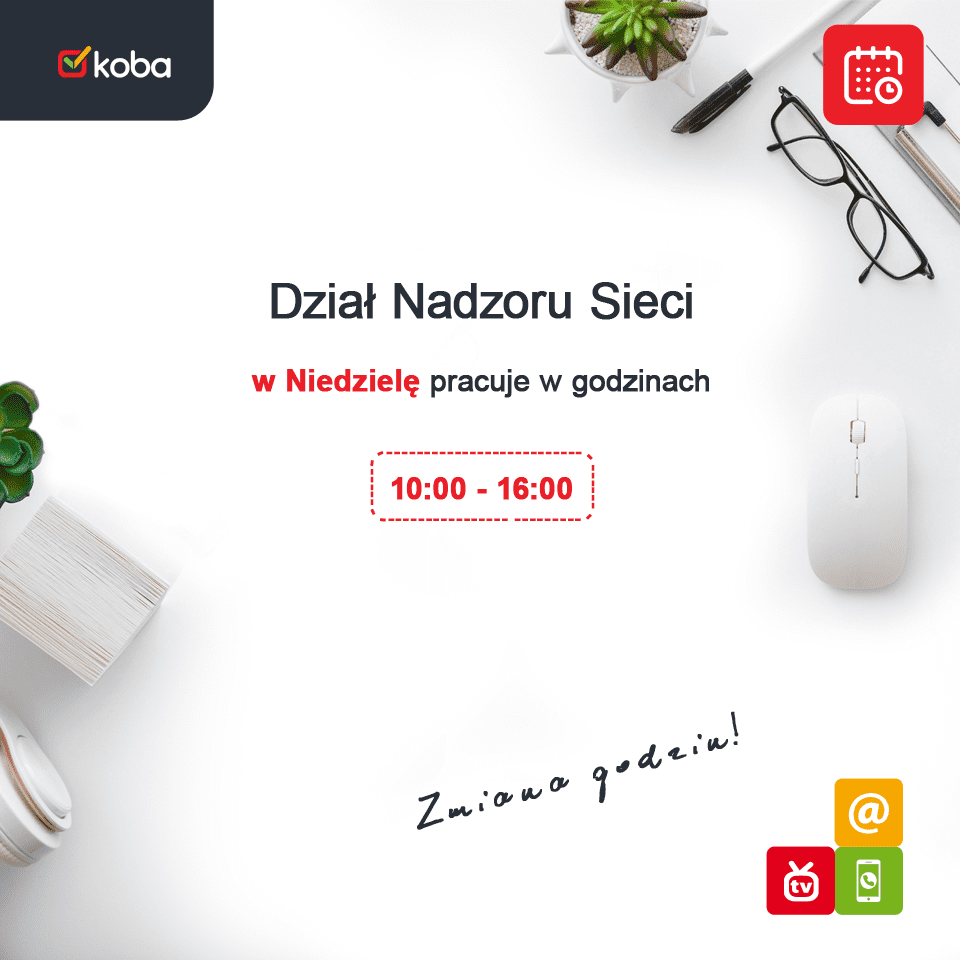 Zmiana godzin pracy 31 maja 2023 Uwaga! Zmiana pracy Działu Nadzoru Sieci Dział Nadzoru Sieci w Niedzielę pracuje w godzinach: 10:00 – 16:00