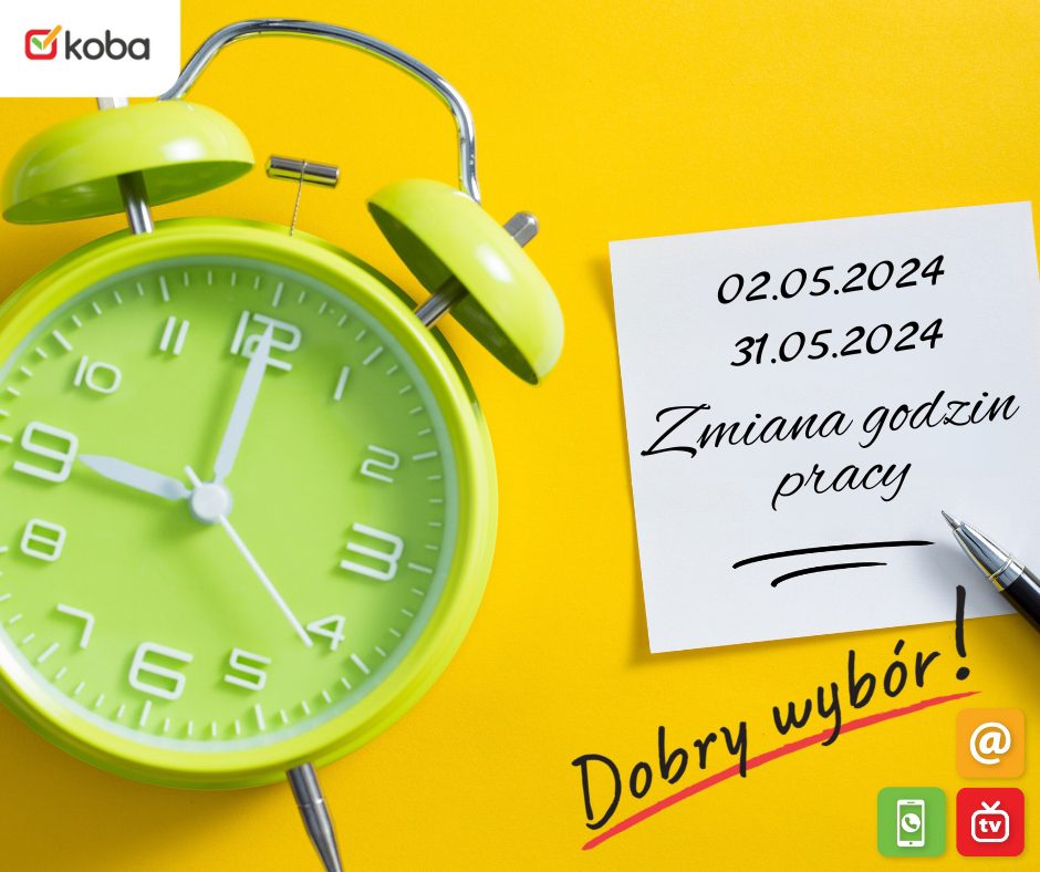 Informacje 26 kwietnia 2024 Zmiana godzin pracy – Maj Drodzy klienci, Dnia 02.05.2024 nasze Biura Obsługi klienta oraz Serwis komputerowy będą pracować od godziny 8.00 do godziny 14.00, a infolinia do 15:00 Natomiast 31.05.2024 Biuro Obsługi Klienta będzie pracować w godzinach 8.00-17.00, Infolinia w godzinach 8.00-19.00, Serwis komputerowy 8.00-14.00. Przepraszamy za wszelkie niedogodności i dziękujemy za zrozumienie.Z pozdrowieniami, Zespół KOBA