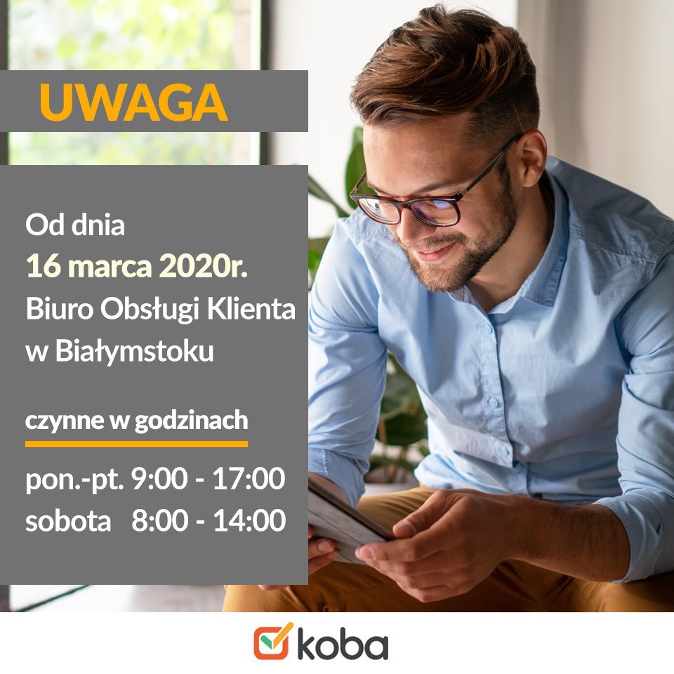 Na Państwa pytania odpowiedzą nasi specjaliści pod numerem telefonu 85 333 33 33 lub za pośrednictwem adresu e-mail bok@koba.pl.